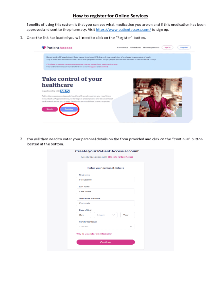 How to register for Online Services Benefits of using this system is that you can see what medication you are on and if this medication has been approved and sent to the pharmacy. Visit https://www.patientaccess.com/