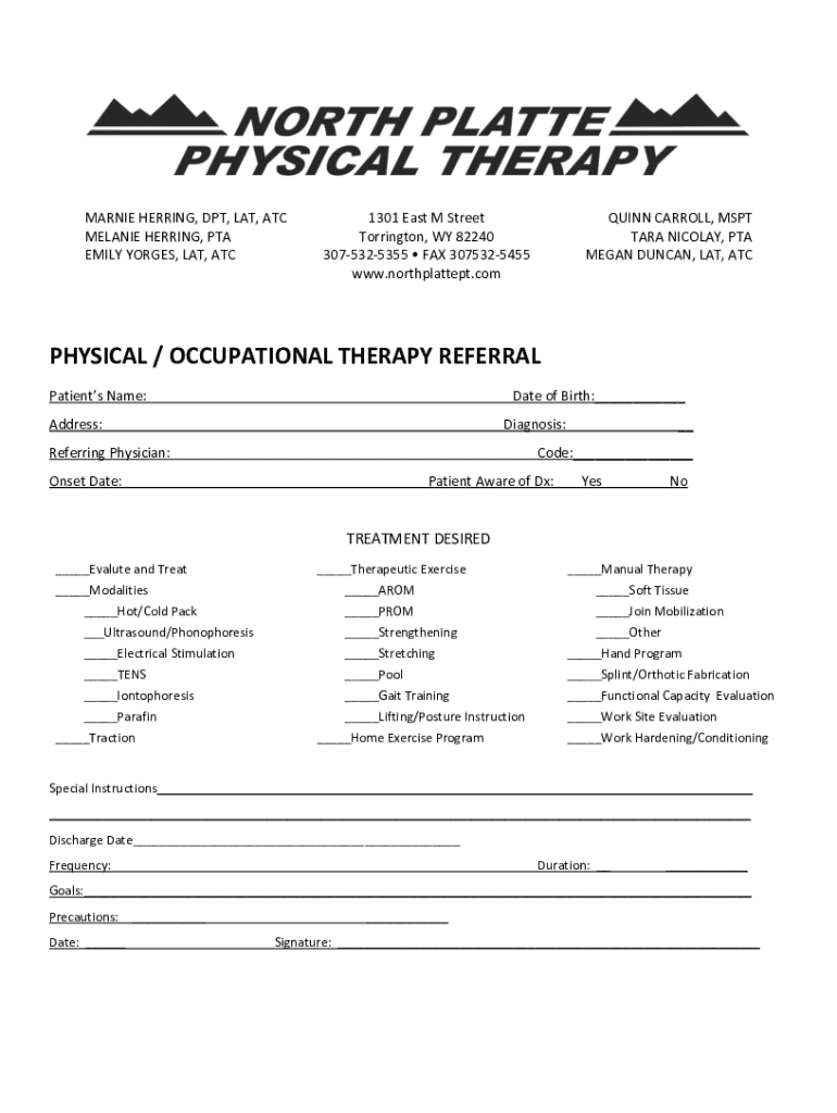 Obtain the physical occupational therapy referral form from your physician or healthcare provider.