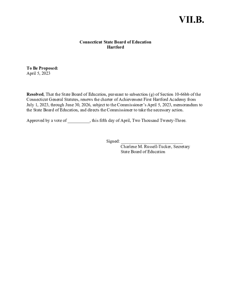 VII. B. Connecticut State Board of Education Hartford Be Proposed: April 5, 2023Resolved, That the State Board of Education, pursuant to subsection (g) of Section 1066bb of the Connecticut General