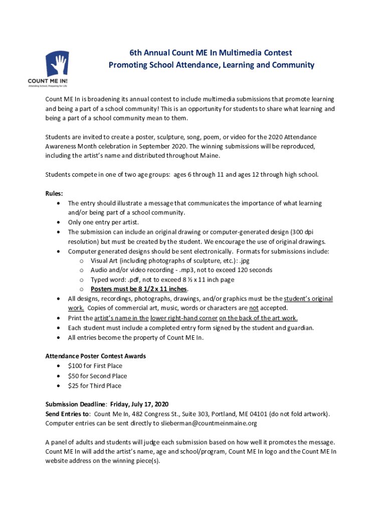 6th Annual Count ME In Multimedia Contest Promoting School Attendance, Learning and CommunityCount ME In is broadening its annual contest to include multimedia submissions that promote learning and