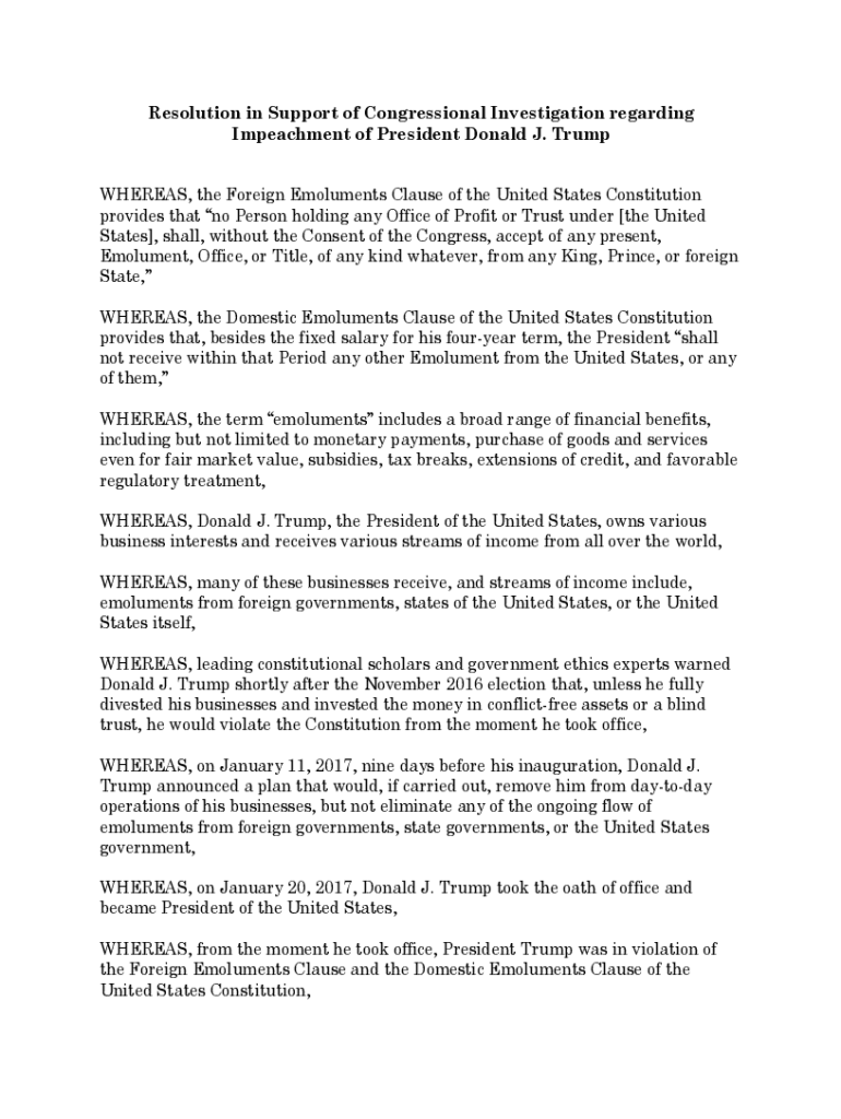 Resolution in Support of Congressional Investigation regarding Impeachment of President Donald J. Trump WHEREAS, the Foreign Emoluments Clause of the United States Constitution provides that no Person