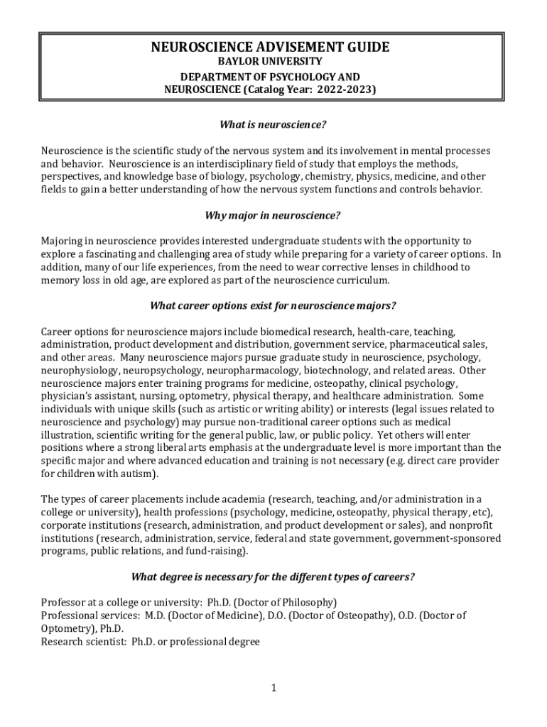 NEUROSCIENCE ADVISEMENT GUIDE BAYLOR UNIVERSITY DEPARTMENT OF PSYCHOLOGY AND NEUROSCIENCE (Catalog Year: 20222023) What is neuroscience? Neuroscience is the scientific study of the nervous system