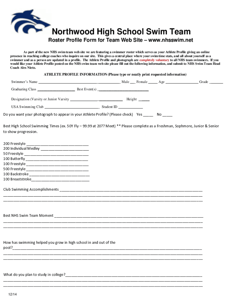 North wood High School Swim Team Roster Profile Form for Team Website www.nhsswim.net As part of the new NHS swim team website we are featuring a swimmer roster which serves as your Athlete Profile
