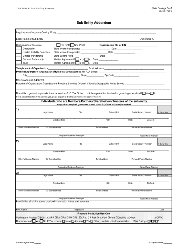 State Savings Bank. S.A. Patriot Act Form Sub Entity AddendumForm 5.11.2018Sub Entity Addendum Legal Name of Account Owning Entity ___ Legal Name of Sub Entity ___ Ownership % ___ for Profit nonprofit
