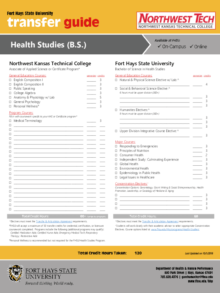 Health Studies (B.S.) Northwest Kansas Technical CollegeFort Hays State UniversityAssociate of Applied Science or Certificate Program×Bachelor of Science in Health StudiesGeneral Education Courses: