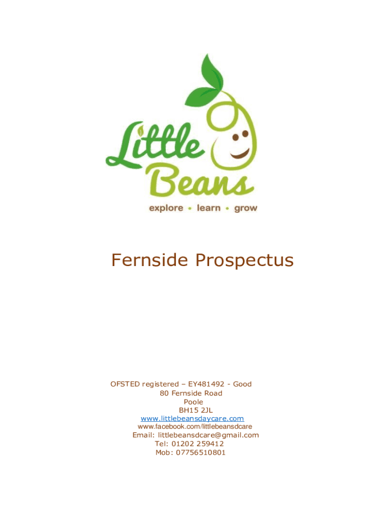 Fern side ProspectusOFSTED registered EY481492 Good 80 Fern side Road Poole BH15 2JL www.littlebeansdaycare.com www.facebook.com/littlebeansdcare Email: littlebeansdcare@gmail.com Tel: 01202 259412