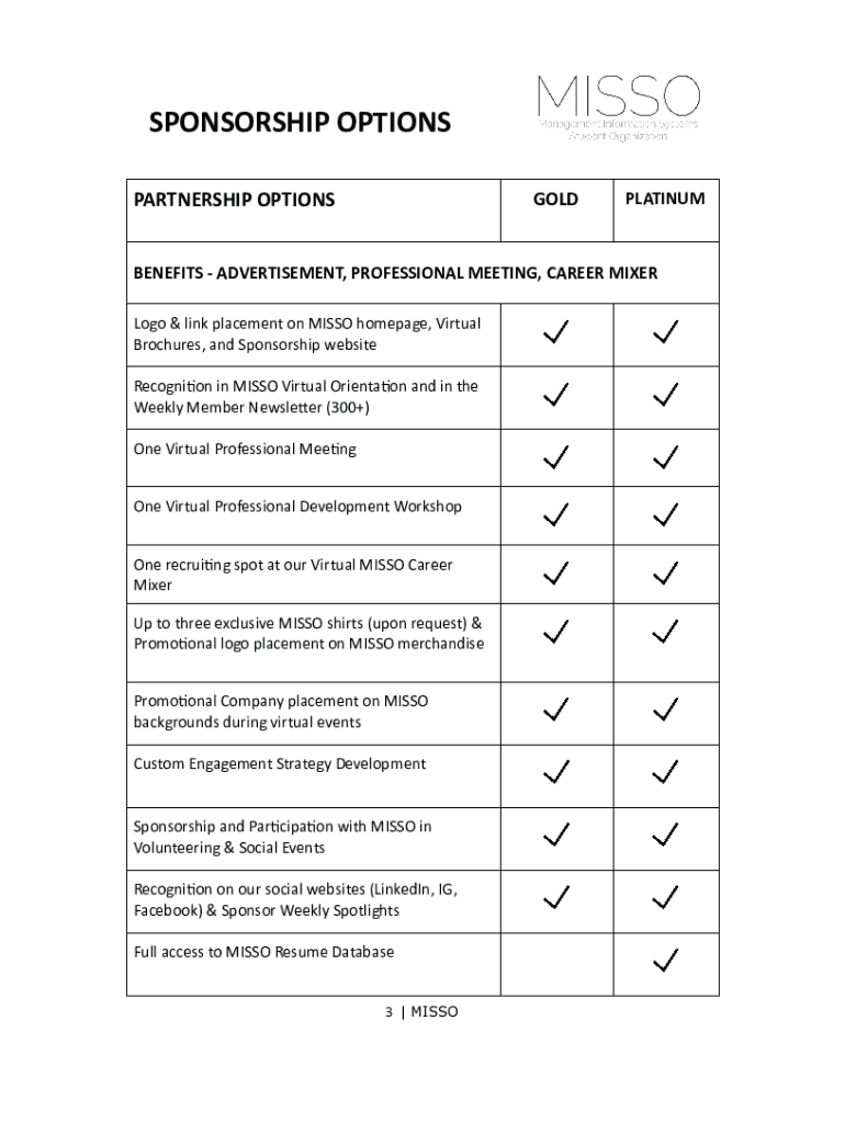 SPONSORSHIP OPTIONS PARTNERSHIP OPTIONSGOLDPLATINUMBENEFITS ADVERTISEMENT, PROFESSIONAL MEETING, CAREER MIXER Logo & link placement on MISS homepage, Virtual Brochures, and Sponsorship website Recognize