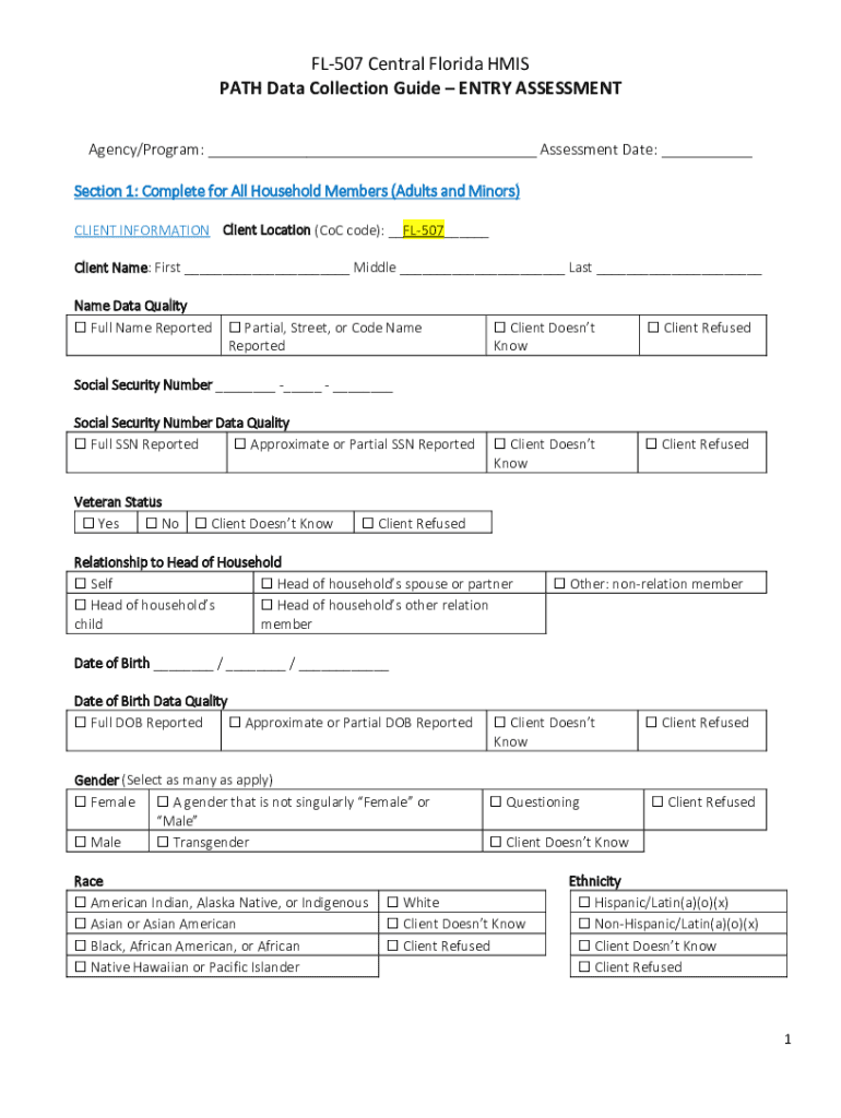 FL507 Central Florida HIS PATH Data Collection Guide ENTRY ASSESSMENT Agency/Program: ___ Assessment Date: ___ Section 1: Complete for All Household Members (Adults and Minors) CLIENT INFORMATION