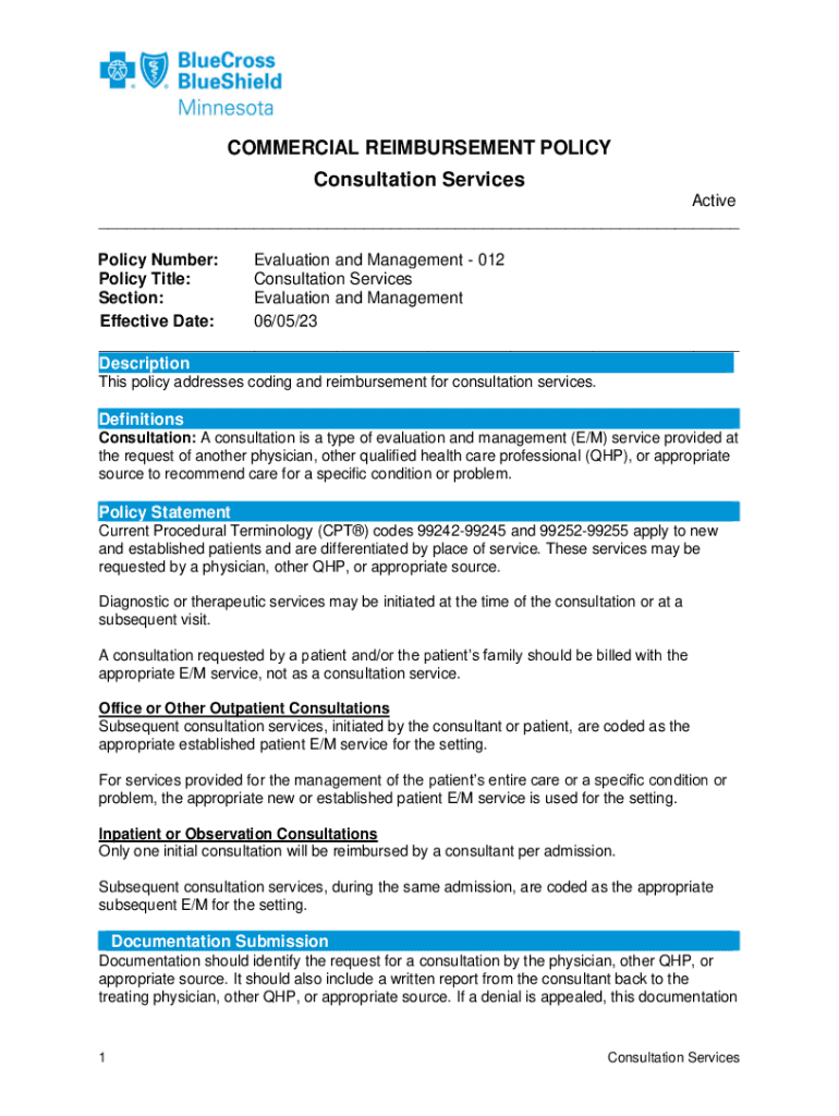 COMMERCIAL REIMBURSEMENT POLICY Consultation Services Active ___ Policy Number: Evaluation and Management 012 Policy Title: Consultation Services Section: Evaluation and Management Effective Date: