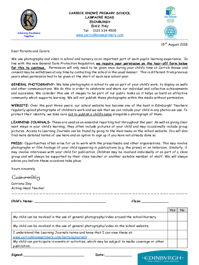 Achieving Excellence TogetherCARRICK KNOW PRIMARY SCHOOL LAMPARD ROAD EDINBURGH EH12 7HU Tel: 0131 334 4505 www.carrickknoweprimary.com 15th August 2018Dear Parents and Carers We use photography and
