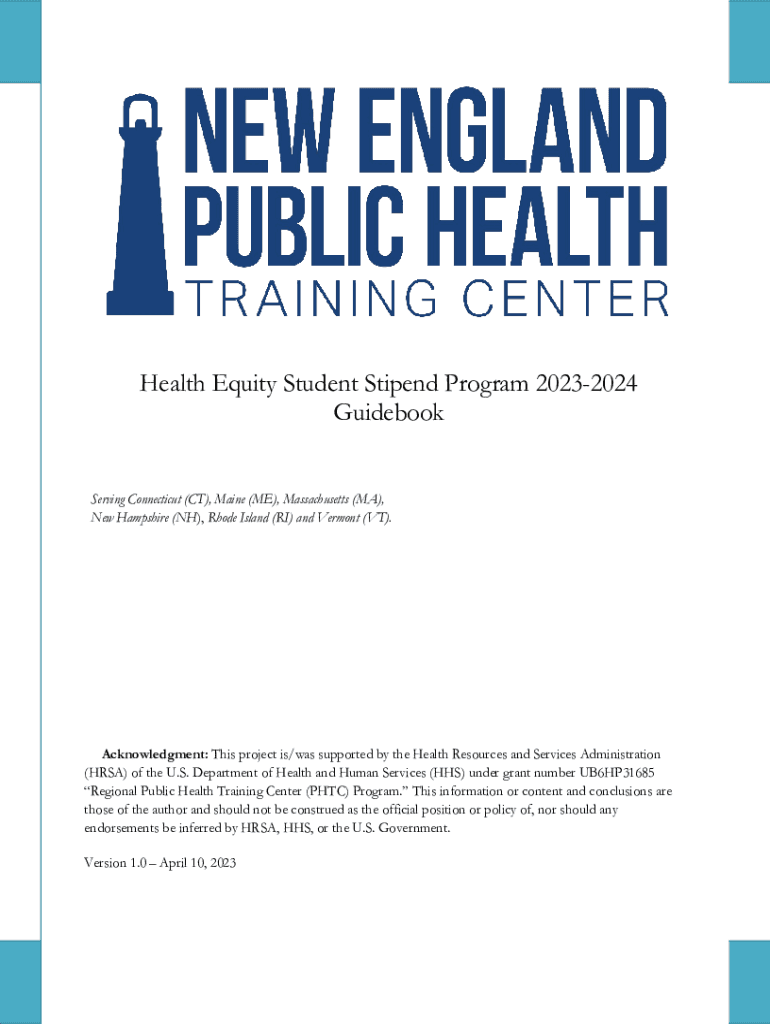Health Equity Student Stipend Program 20232024 Guidebook Serving Connecticut (CT), Maine (ME), Massachusetts (MA), New Hampshire (NH), Rhode Island (RI) and Vermont (VT). Acknowledgment: This project