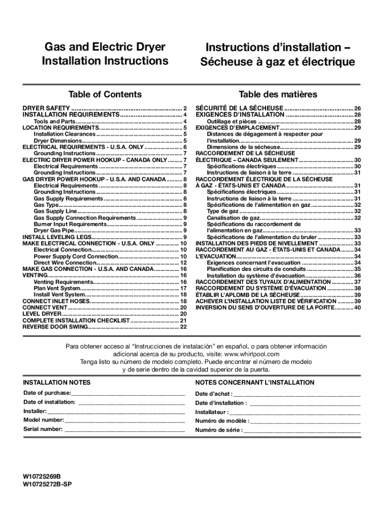 Gas and Electric Dryer Installation InstructionsInstructions installation Scheme gas et lectriqueTable of Contestable DES matiresDRYER SAFETY ................................................................