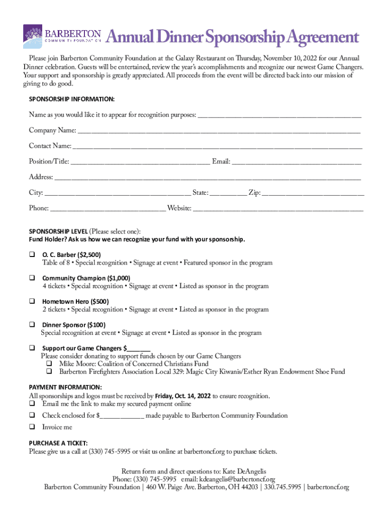 Annual Dinner Sponsorship AgreementPlease join Barberton Community Foundation at the Galaxy Restaurant on Thursday, November 10, 2022, for our Annual Dinner celebration. Guests will be entertained,