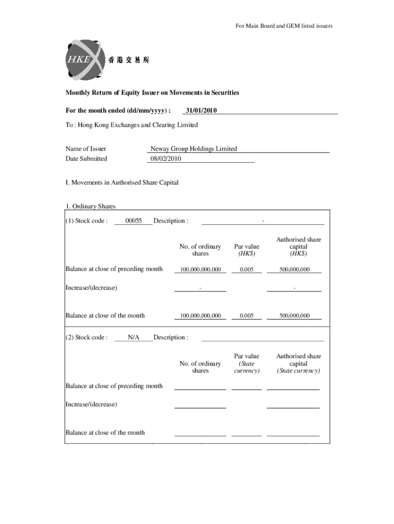 For Main Board and GEM listed issuersMonthly Return of Equity Issuer on Movements in Securities For the month ended (dd/mm/YYY) :31/01/2010To : Hong Kong Exchanges and Clearing LimitedName of Issuer