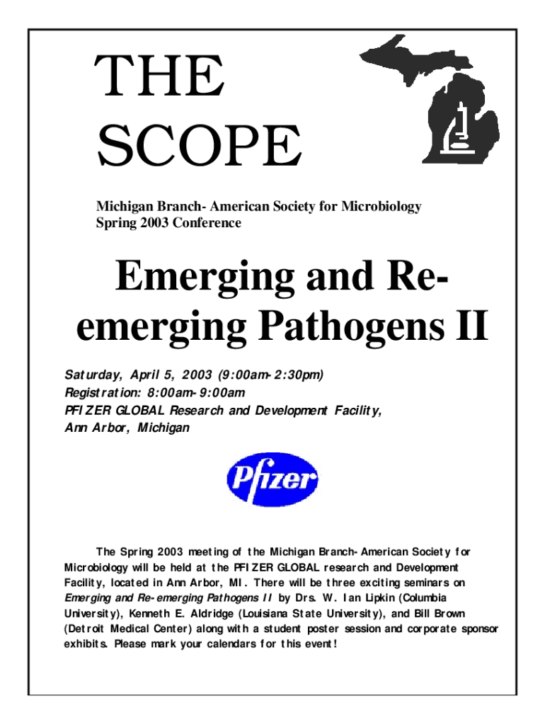THE SCOPE Michigan Branch American Society for Microbiology Spring 2003 ConferenceEmerging and Reemerging Pathogens II Saturday, April 5, 2003 (9:00am2:30pm) Registration: 8:00am9:00am PFIZER GLOBAL