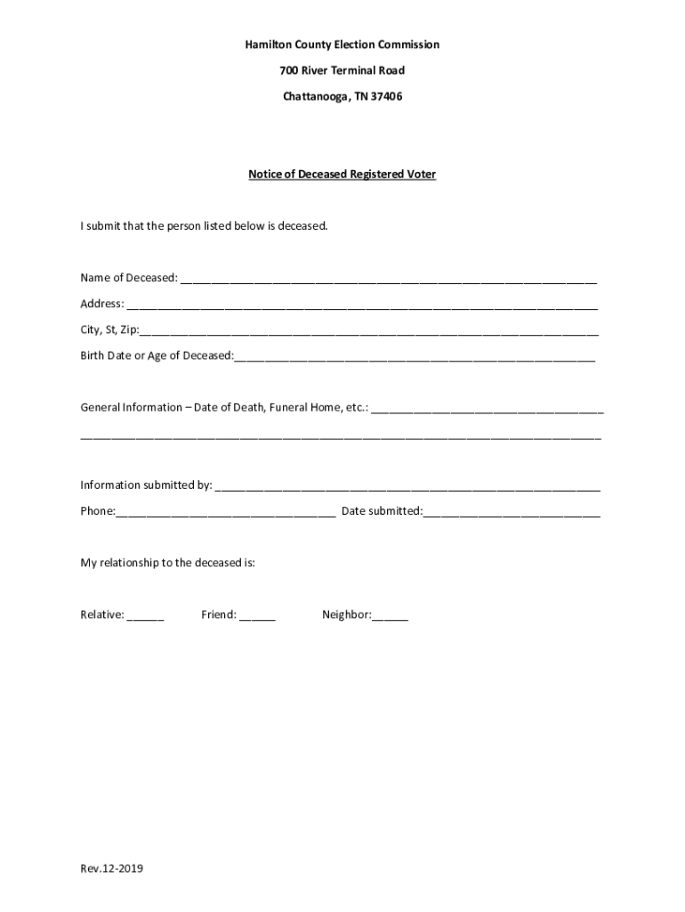 Hamilton County Election Commission 700 River Terminal Road Chattanooga, TN 37406Notice of Deceased Registered Voters submit that the person listed below is deceased. Name of Deceased: ___ Address: