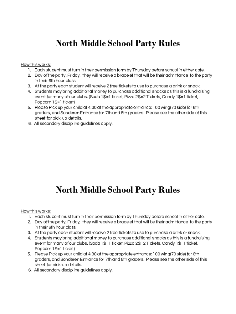 North Middle School Party Rules Howthisworks: 1. EachstudentmustturnintheirpermissionformbyThursdaybeforeschoolineithercafe. 2. Dayoftheparty, Friday, theywillreceiveabraceletthatwillbetheiradmittancetotheparty