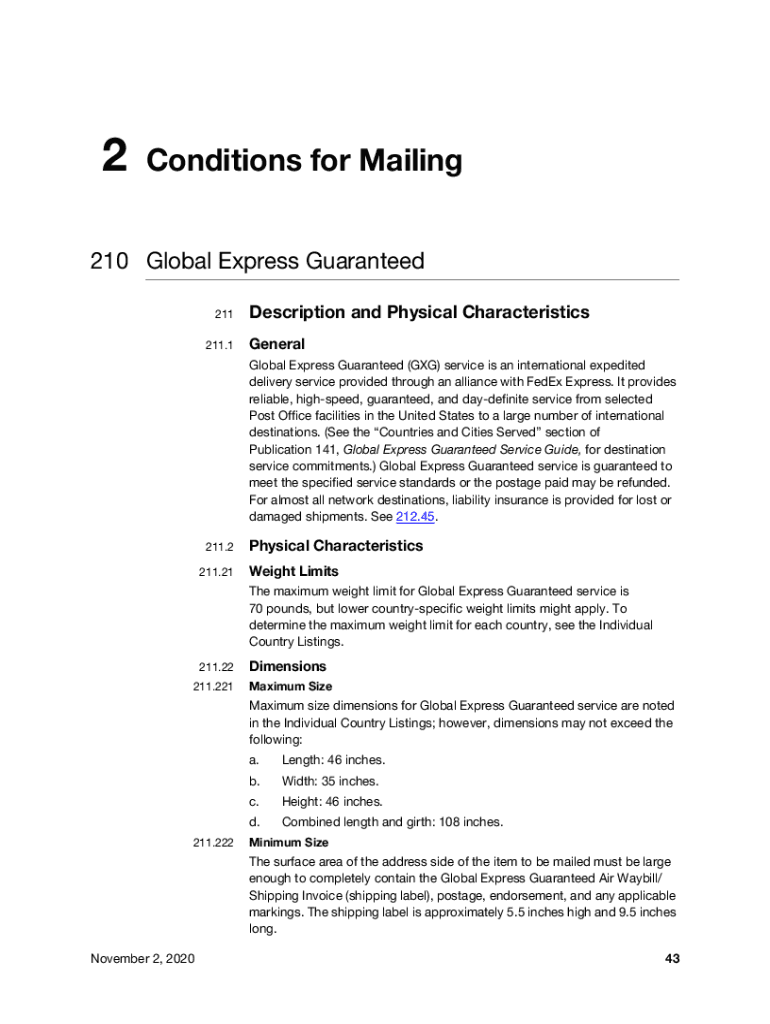 Contents2Country IndexConditions for Mailing210 Global Express Guaranteed 211 211.1Description and Physical Characteristics General Global Express Guaranteed (GAG) service is an international expedited