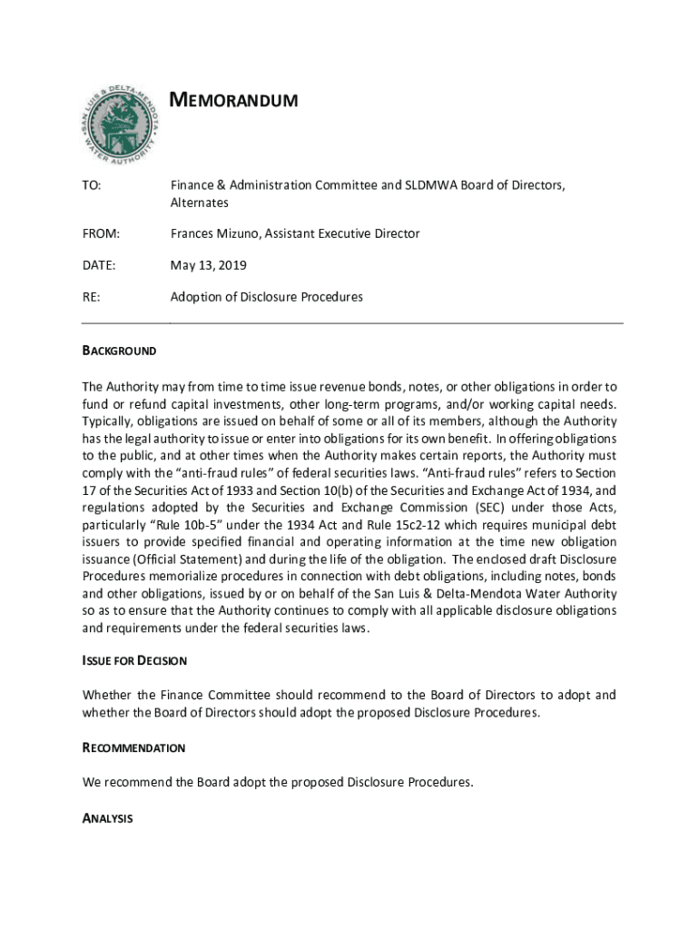 AlternatesFROM:Frances Milano, Assistant Executive Directorate:May 13, 2019RE:Adoption of Disclosure ProceduresBACKGROUND