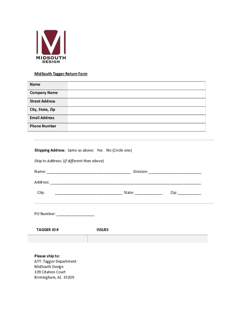 MidSouth Tagger Return Form Name Company Name Street Address City, State, Zip Email Address Phone Number Shipping Address: Same as above: Yes No (Circle one) Ship to Address: (if different from above)