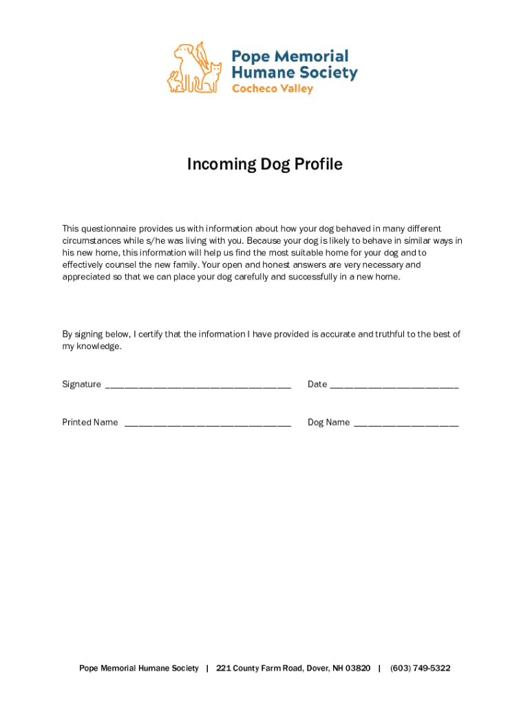 Incoming Dog Profiles questionnaire provides us with information about how your dog behaved in many circumstances while s/he was living with you. Because your dog is likely to behave in similar ways