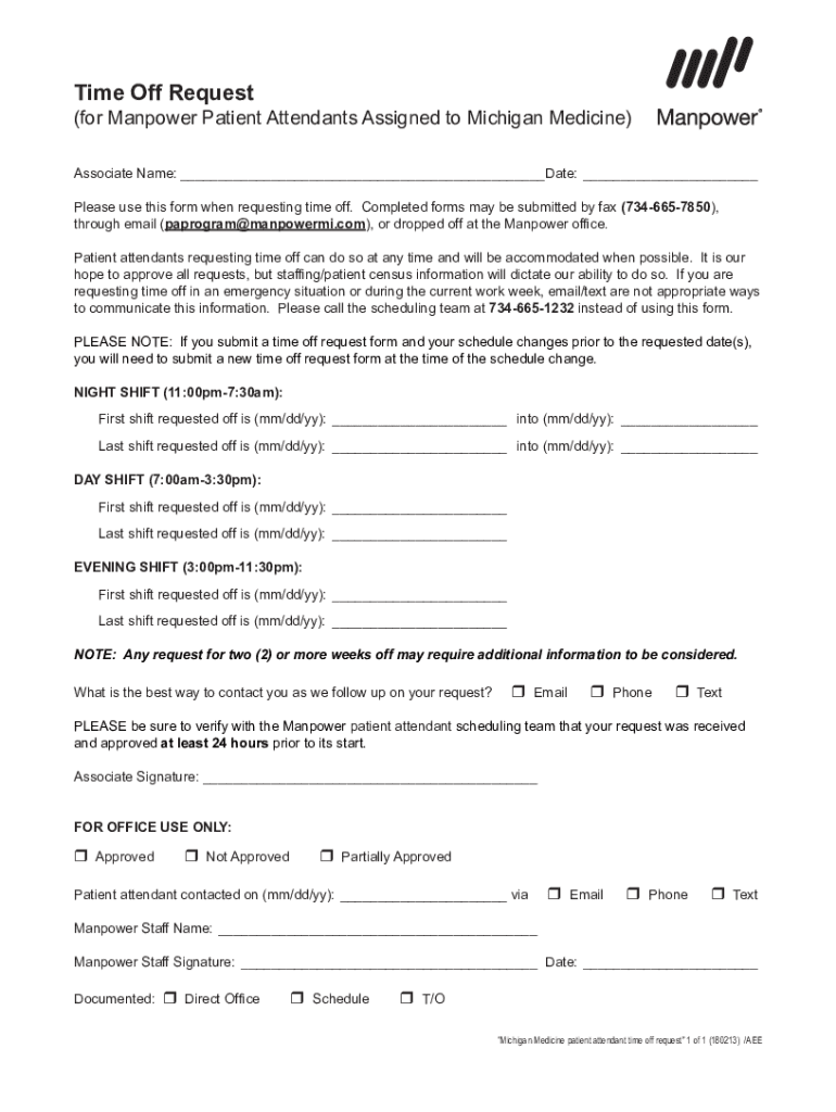 Time Off Request(for Manpower Patient Attendants Assigned to Michigan Medicine) Associate Name:___Date:___ Please use this form when requesting time off. Completed forms may be submitted by fax (7346657850),