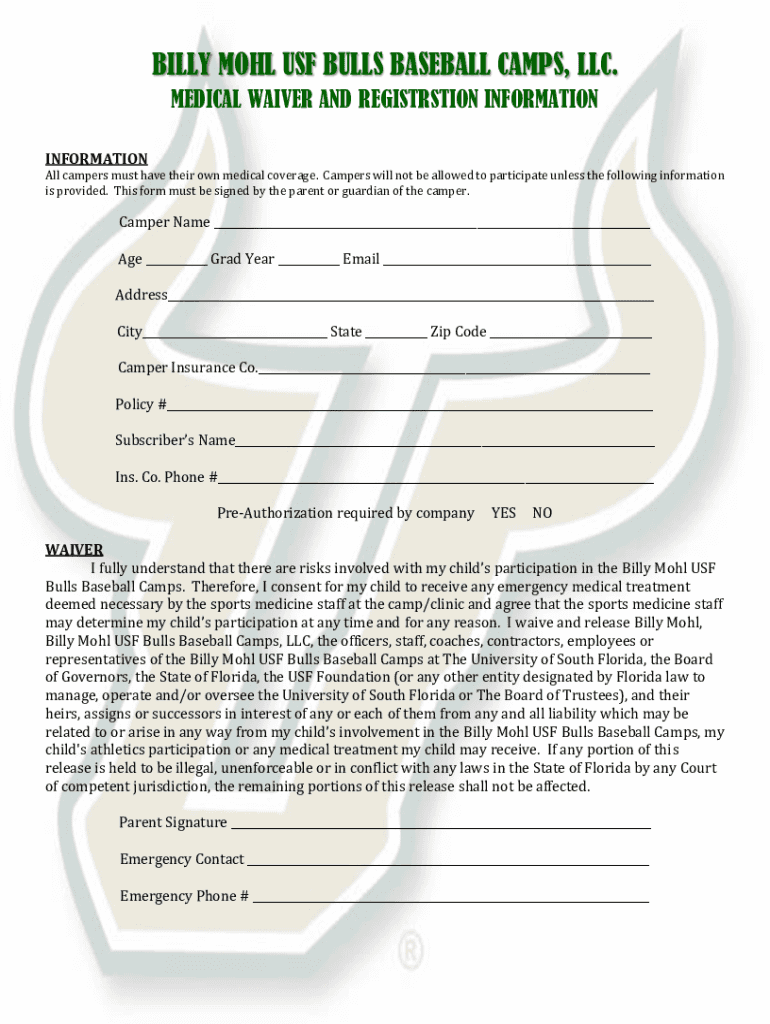 BILLY OHL USF BULLS BASEBALL CAMPS, LLC. MEDICAL WAIVER AND REGISTRATION INFORMATION All campers must have their own medical coverage. Campers will not be allowed to participate unless the following