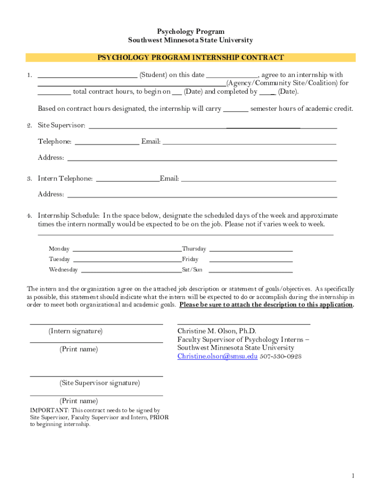 Psychology Program Southwest Minnesota State University PSYCHOLOGY PROGRAM INTERNSHIP CONTRACT 1.(Student) on this date ___, agree to an internship with (Agency/Community Site/Coalition) for total