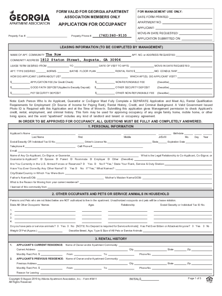 FORM VALID FOR GEORGIA APARTMENT ASSOCIATION MEMBERS ONLY MANAGEMENT USE ONLY: DATE FORM PRINTED APARTMENT NO.APPLICATION FOR OCCUPANCY Property Fax #:APPLICANT: MOVE IN DATE REQUESTED:(762)2609135Property