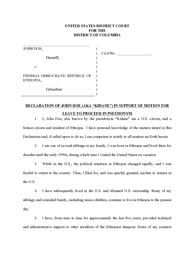 UNITED STATES DISTRICT COURT FOR THE DISTRICT OF COLUMBIA ___ JOHN DOE, Plaintiff, v. FEDERAL DEMOCRATIC REPUBLIC OF ETHIOPIA, Defendant.) ))))))))))Civil No.: ___DECLARATION OF JOHN DOE (AKA KID