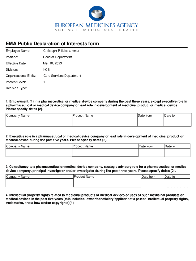 EMA Public Declaration of Interests form Employee Name:Christoph PillichshammerPosition:Head of DepartmentEffective Date:Mar 10, 2023Division:ICSOrganisational Entity:Core Services DepartmentInterest
