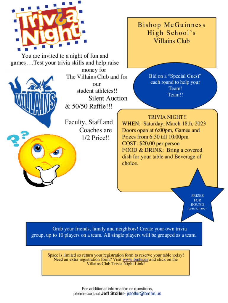 Bishop Guinness High Schools Villains Club You are invited to a night of fun and games. Test your trivia skills and help raise money for The Villains Club and for our student athletes!! Silent Auction