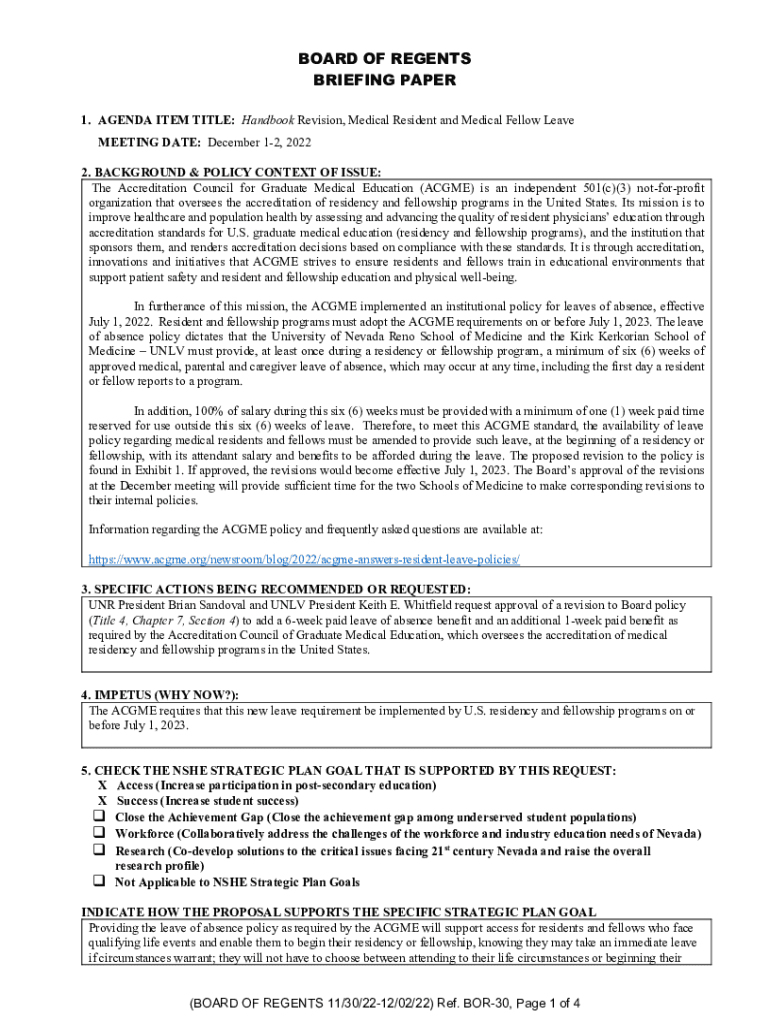 BOARD OF REGENTS BRIEFING PAPER 1. AGENDA ITEM TITLE: Handbook Revision, Medical Resident and Medical Fellow Leave MEETING DATE: December 12, 2022 2. BACKGROUND & POLICY CONTEXT OF ISSUE: The Accreditation