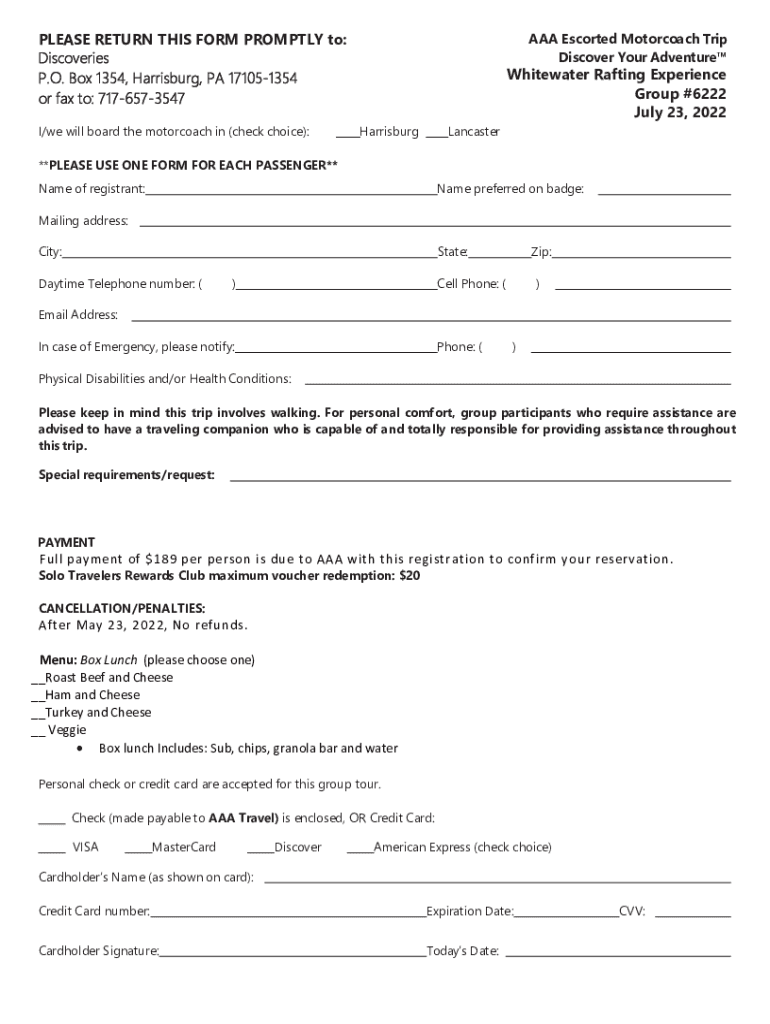 PLEASE RETURN THIS FORM PROMPTLY to: Discoveries P.O. Box 1354, Harrisburg, PA 171051354 or fax to: 7176573547 I/we will board the motor coach in (check choice):AAA Escorted Motor coach Trip Discover