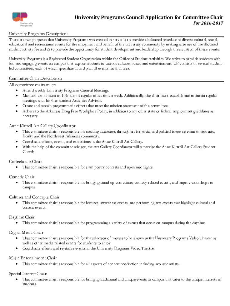 University Programs Council Application for Committee Chair For 20162017 University Programs Description: There are two purposes that University Programs was created to serve: 1) to provide a balanced