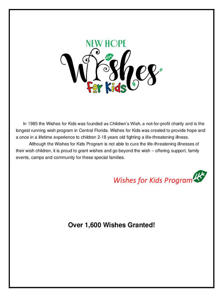 longest running wish program in Central Florida. Wishes for Kids was created to provide hope and
