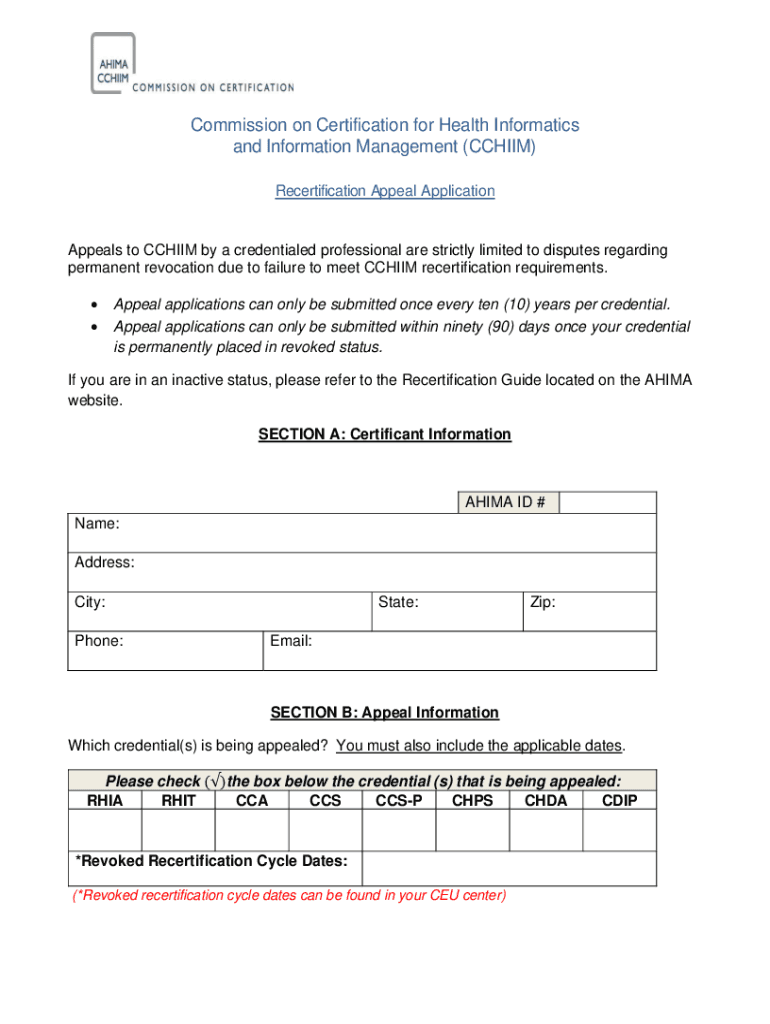 Commission on Certification for Health Informatics and Information Management (CCH IIM) Recertification Appeal ApplicationAppeals to CCH IIM by a credentialed professional are strictly limited to