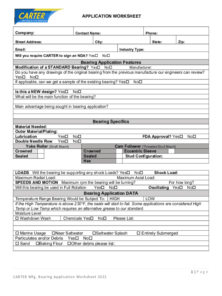 Street Address:Contact Name:Phone:City:Email:State:Zip:Industry Type:Will you require CARTER to sign an NDA? YesNoBearing Application FeaturesModification of a STANDARD