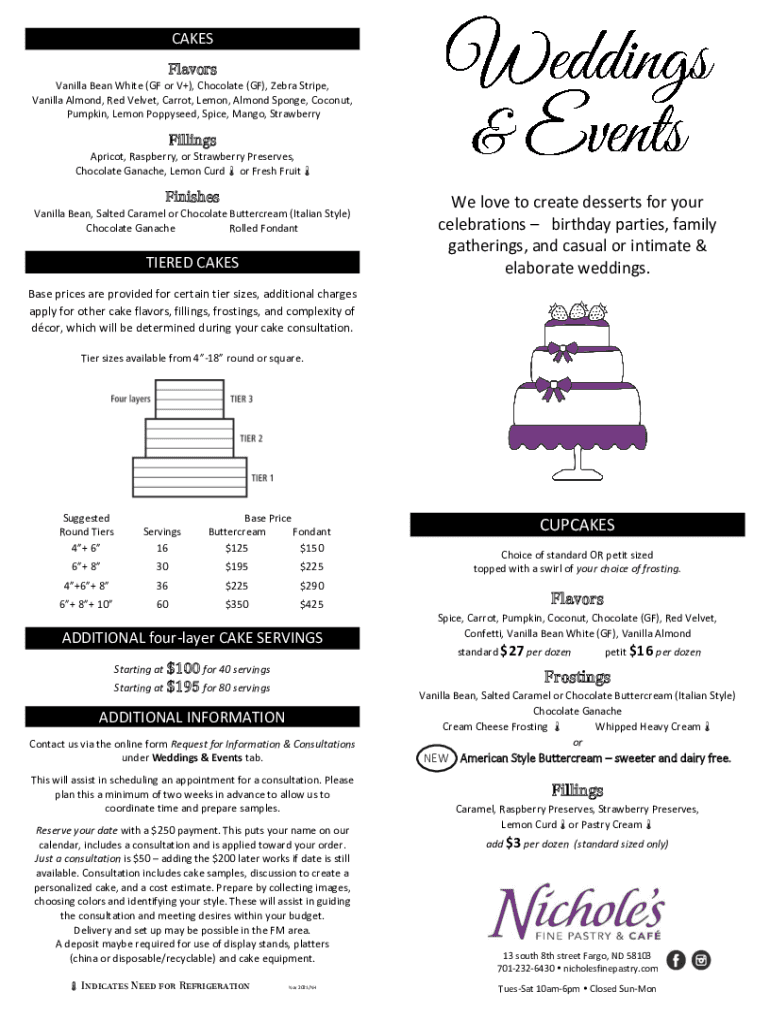 CAKES Flavors Vanilla Bean White (GF or V+), Chocolate (GF), Zebra Stripe, Vanilla Almond, Red Velvet, Carrot, Lemon, Almond Sponge, Coconut, Pumpkin, Lemon Poppy seed, Spice, Mango, StrawberryFillings