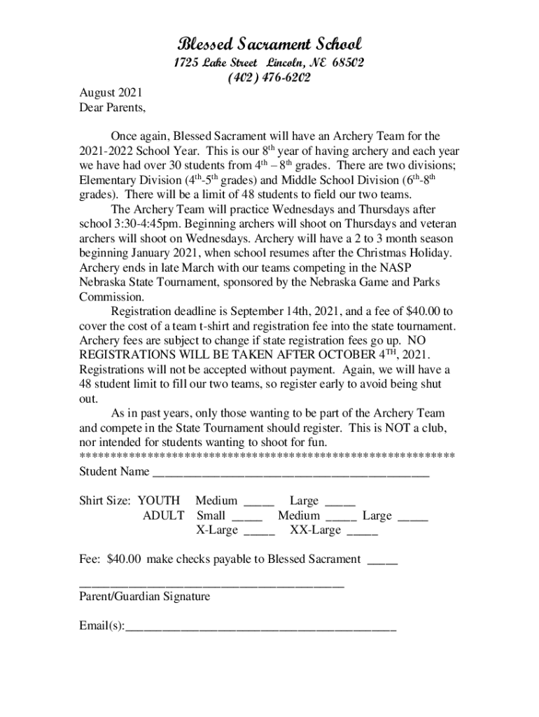 Blessed Sacrament School1725 Lake Street Lincoln, NE 68502 (402) 4766202 August 2021 Dear Parents, Once again, Blessed Sacrament will have an Archery Team for the 20212022 School Year. This is our
