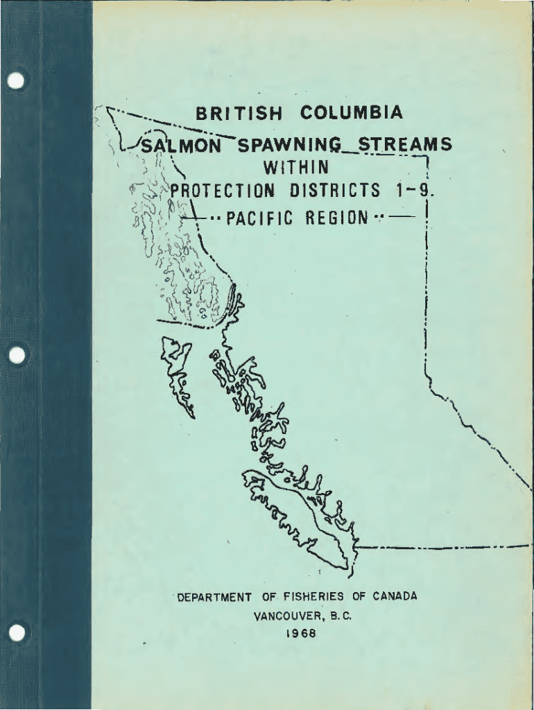 DEPARTMENT FISHERIES OF CANADA VANCOUVER, B. C.1968This booklet lists the names and shows the locations of all main stem salmon spawning streams in British Columbia, exclusive of those streams draining