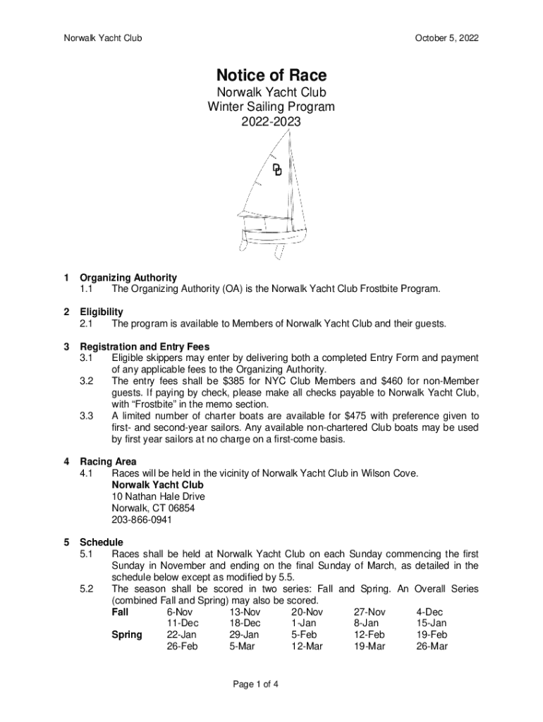 Norwalk Yacht Club October 5, 2022Notice of Race Norwalk Yacht Club Winter Sailing Program 202220231Organizing Authority 1.1 The Organizing Authority (OA) is the Norwalk Yacht Club Frostbite Program.2Eligibility
