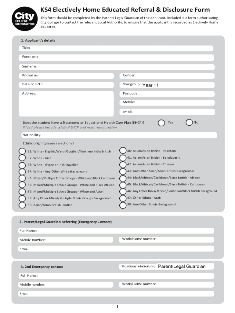 KS4 Electively Home Educated Referral & Disclosure Form This form should be completed by the Parent/ Legal Guardian of the applicant. Included is a form authoritative City College to contact the relevant