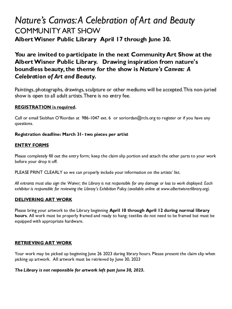 To fill out Natures Canvas: A Celebration forms, participants need to provide details such as personal information, event participation details, and any required artistic submissions.