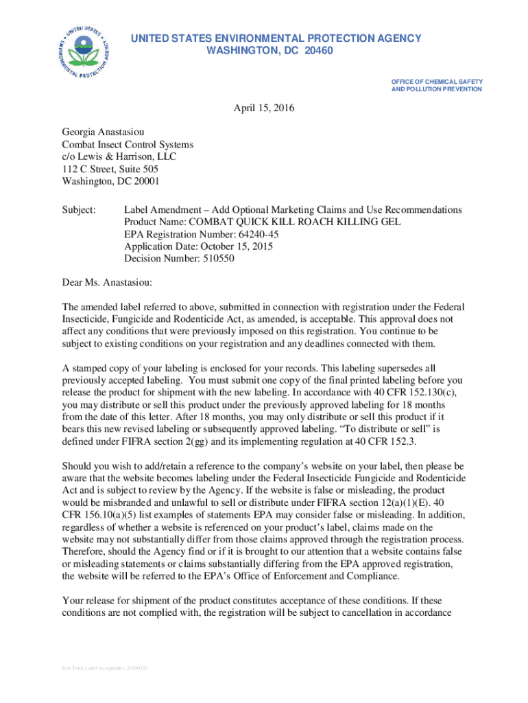 UNITED STATES ENVIRONMENTAL PROTECTION AGENCY WASHINGTON, DC 20460 OFFICE OF CHEMICAL SAFETY AND POLLUTION PREVENTION April 15, 2016, Georgia Anastasios Combat Insect Control Systems c/o Lewis & Harrison,