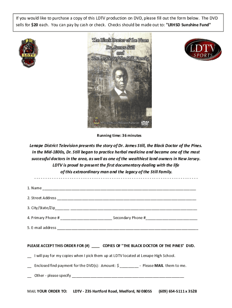 IfyouwouldliketopurchaseacopyofthisLDTVproductiononDVD, pleasefillouttheformbelow. The DVD sellsfor$20each. Youcanpaybycashorcheck. Checksshouldbemadeoutto:\” LRHSDSunshineFund\” Running time:36minutesLenapeDistrictTelevisionpresentsthestoryofDr.