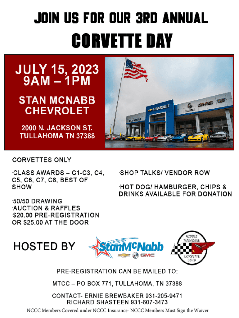 JULY15,2023 9AM 1PM STAN McNab CHEVROLET 2000 N.JACKSON ST. TULLAHOMATN37388NCCC Members Covered under CCC Insurance CCC Members Must Sign the Waiver3rd Annual MTC Corvette Day Corvette Show Stan