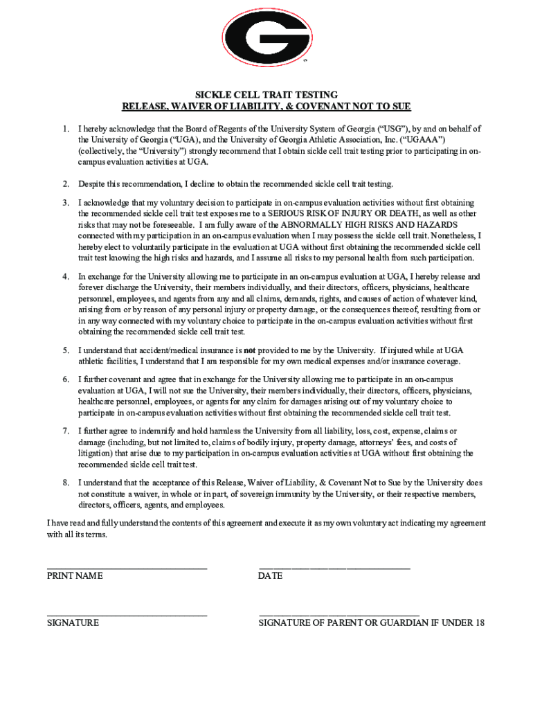 SICKLE CELL TRAIT TESTING RELEASE, WAIVER OF LIABILITY, & COVENANT NOT TO SUE 1. I hereby acknowledge that the Board of Regents of the University System of Georgia (USG), by and on behalf of the University