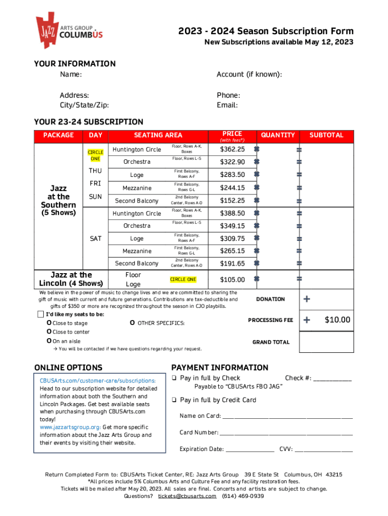 2023 2024 Season Subscription Form New Subscriptions available May 12, 2023YOUR INFORMATION Name:Account (if known):Address: City/State/Zip:Phone: Email:YOUR 2324 SUBSCRIPTION PACKAGED CIRCLE ONETHUJazz