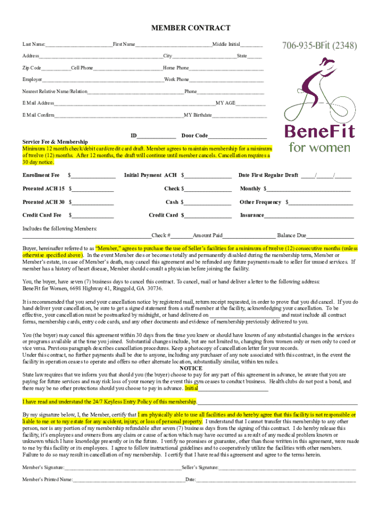 MEMBER CONTRACT Last Name:___First Name___Middle Initial___ Address___City___State___ Zip Code___Cell Phone___Home Phone___ Employer___Work Phone___ The Nearest Relative Name/Relation___Phone___ E